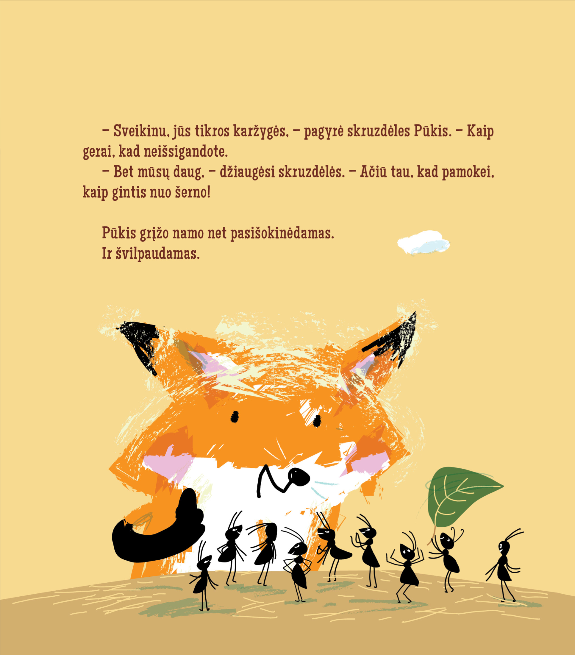 Devyniolioktoji Vytauto V. Landsbergio pasakų serijos knygelė mažiesiems skaitytojams "Pūkis ir skruzdėlės". Ar gali mažos skruzdėlės sustabdyti niekadėją šerną, atėjusį griauti jų skruzdėlyno? Lapiukas Pūkis galvoja, kad taip. Jis susidraugauja su skruzdėlėm ir skuba joms į pagalbą, kai skruzdėlyną užpuola šernas. Ir joms pavyksta! Ne tik išvyti šerną, bet ir suprasti, kad tik susivieniję mažieji miško gyventojai gali apsigint nuo didelio ir pikto, norinčio naikinti jų tėviškę.